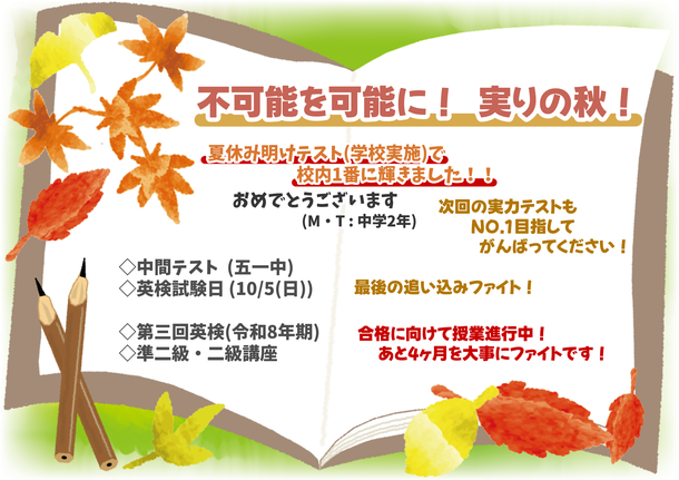 ※社会が苦手なので少し苦戦しましたが最後は念願のトップ達成!中2の冬から通って来ました。本当にコツコツと真剣に集中力をもって今も「法学部」合格目指して頑張っています。